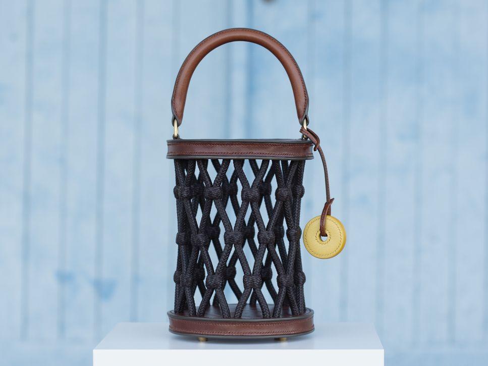 Pieza «Nasa«, del obradoiro Raíces Nómadas Atelier (Ribadeo, Lugo), un bolso de mano realizado en piel de curtido vegetal, que busca reinterpretar a través da marroquinería y del trenzado aquellas nasas antiguas elaboradas con madera y mimbres, en un homenaje a la cultura marítima de Galicia.