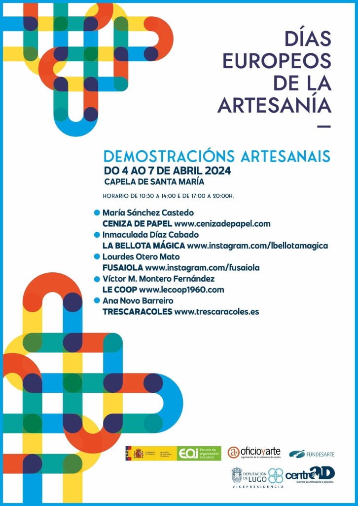 Además, el Centro de Artesanía de la Diputación de Lugo celebrará estos días con una demostración de oficios artesanales en la Capilla de Santa María en Lugo, en el que participarán Ceniza de Papel (cerámica), Fusaiola (tejido), La Bellota Mágica (cerámica), Tres Caracoles y Lecoop (ambos trabajan el cuero).
