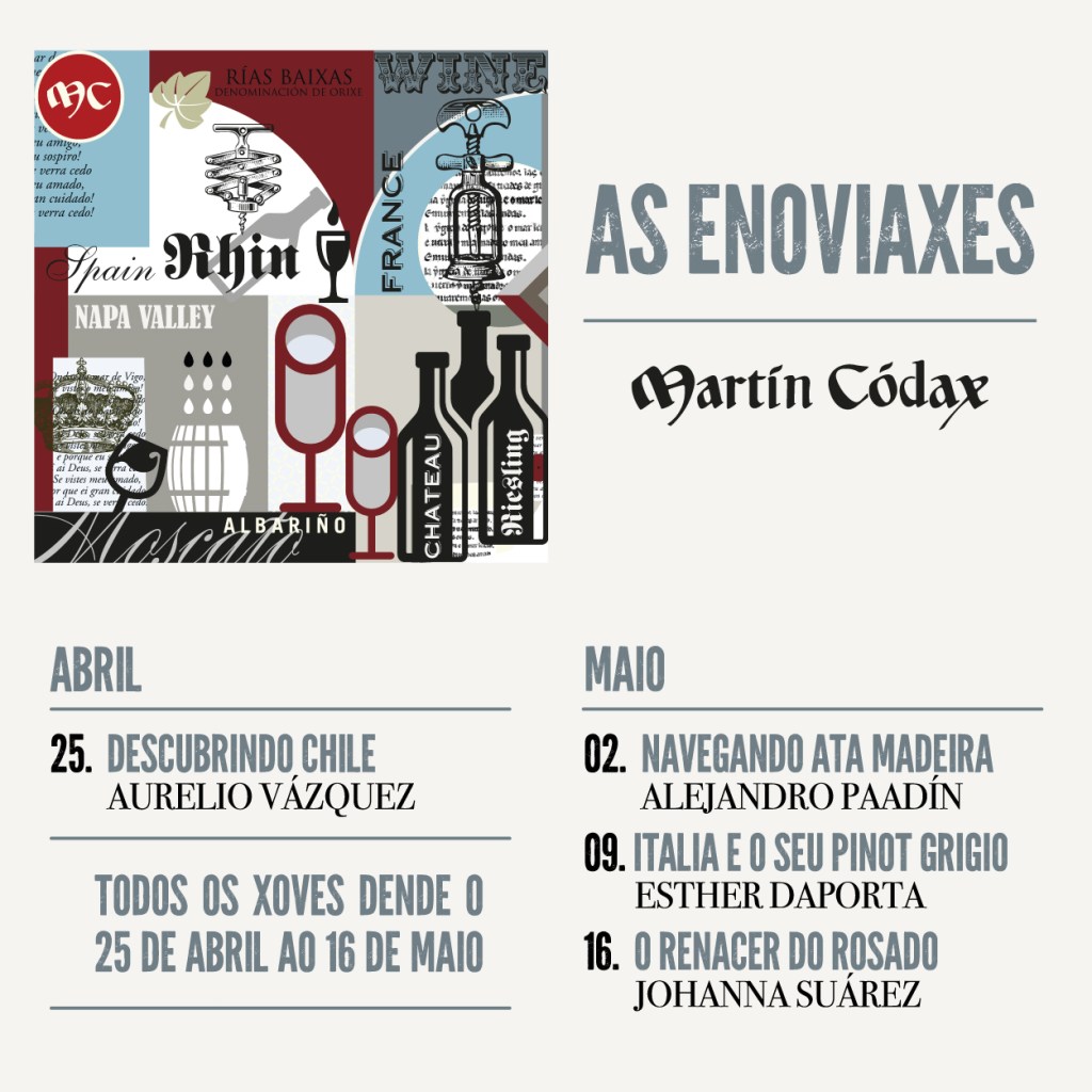 As Enoviaxes tendrán lugar en abril y mayo, un recorrido enológico que dan a conocer y ponen de manifiesto la versatilidad de distintos vinos. De la mano de diferentes invitados expertos, se celebrarán en la terraza de Bodegas Martín Códax, desde el jueves 25 de abril y hasta el jueves 16 de mayo.