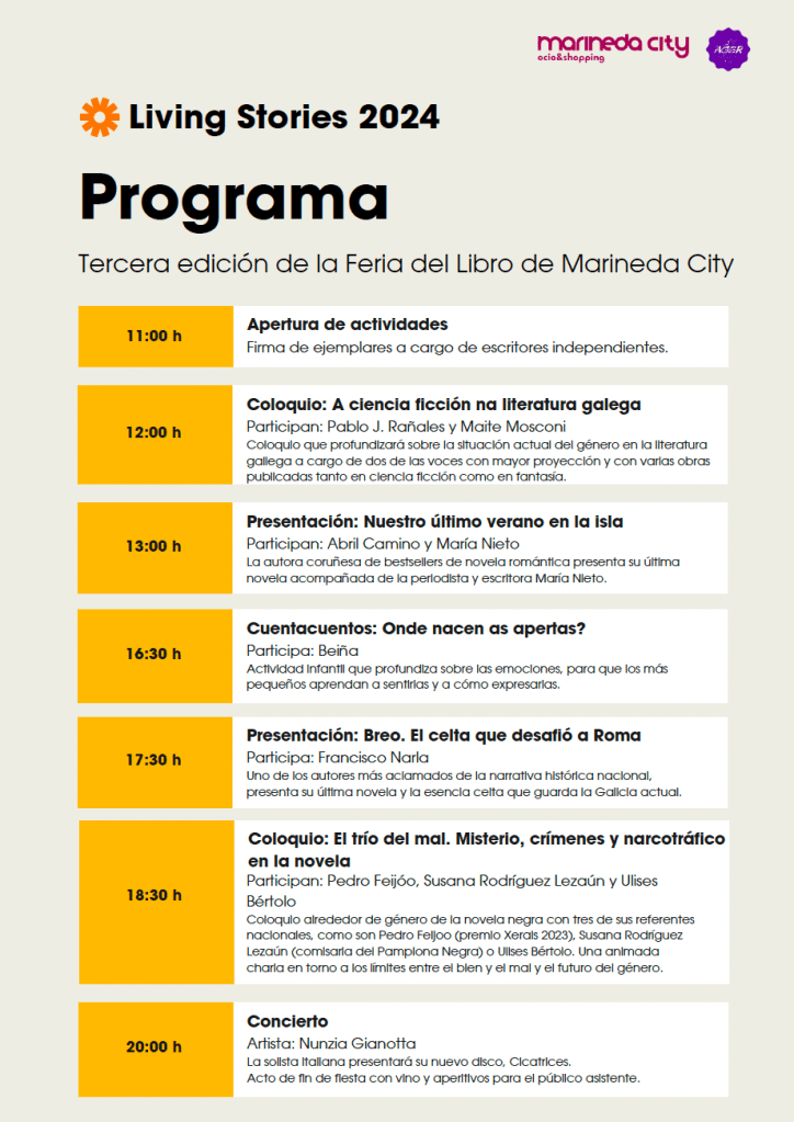 El sábado 4 de mayo, Marineda City celebrará la tercera edición de su Feria del Libro. A lo largo de la jornada, de 11 a 21.30 horas, contará con la presencia de una docena de autores, entre los que se encuentran el Premio Xerais de Novela 2023, Pedro Feijoo, la escritora y comisaria del festival de literatura Pamplona Negra, Susana Rodríguez Lezaún, y el abogado y escritor Ulises Bértolo. Durante el evento, que tendrá lugar en el local Living Art Studio (planta 0), los escritores firmarán ejemplares de sus últimos trabajos y también habrá coloquios sobre novela romántica, ciencia ficción gallega o la novela negra.