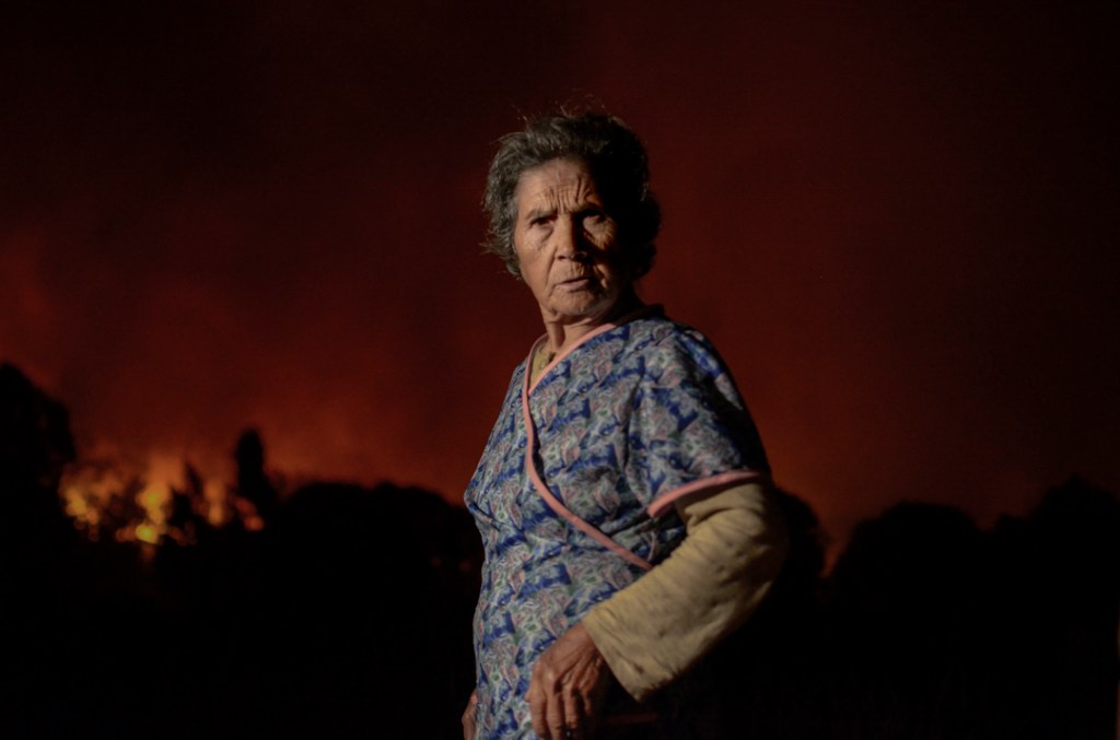 Maruja Rodríguez, 76, vecina de pueblo de Toubes, (Ourense), ante las llamas de un incendio forestal. Los incendios forestales que se producen en horario nocturno resultan más complicados de controlar por la imposibilidad de actuación de los medios aéreos.
