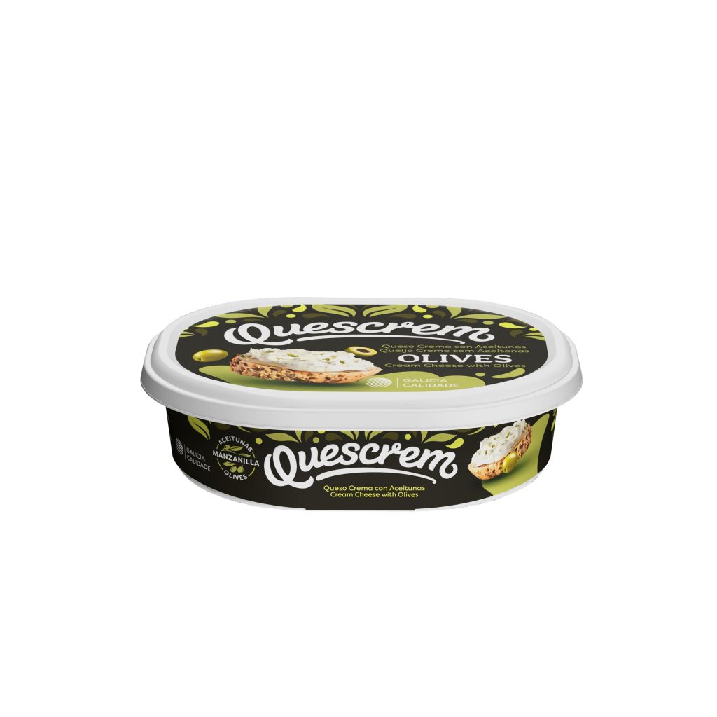 Quescrem Aceitunas se elabora con una selección de aceitunas Manzanilla españolas y ofrece un sabor intenso y equilibrado. Este queso crema no contiene sabores ni aromas artificiales y destaca por su cremosidad, lo que lo hace ideal para entrantes, canapés y recetas tanto frías como calientes.