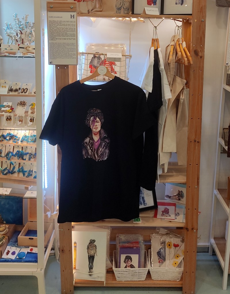 Además, elementos de la cultura gastronómica gallega como las sardinas y las truchas forman parte de esta muestra, que tampoco se olvida de las peregrinas o mujeres de espaldas, que se pueden encontrar en láminas, camisetas o tote bags.
