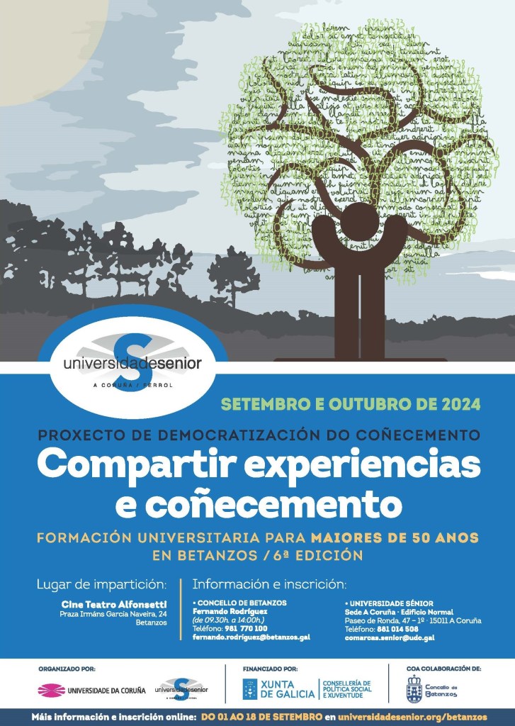 La inscripción, que es gratuita, puede realizarse on line a través espacio web UDC Sénior Betanzos o presencialmente a través Departamento de Educación del Ayuntamiento de Betanzos, hasta el 18 de septiembre.