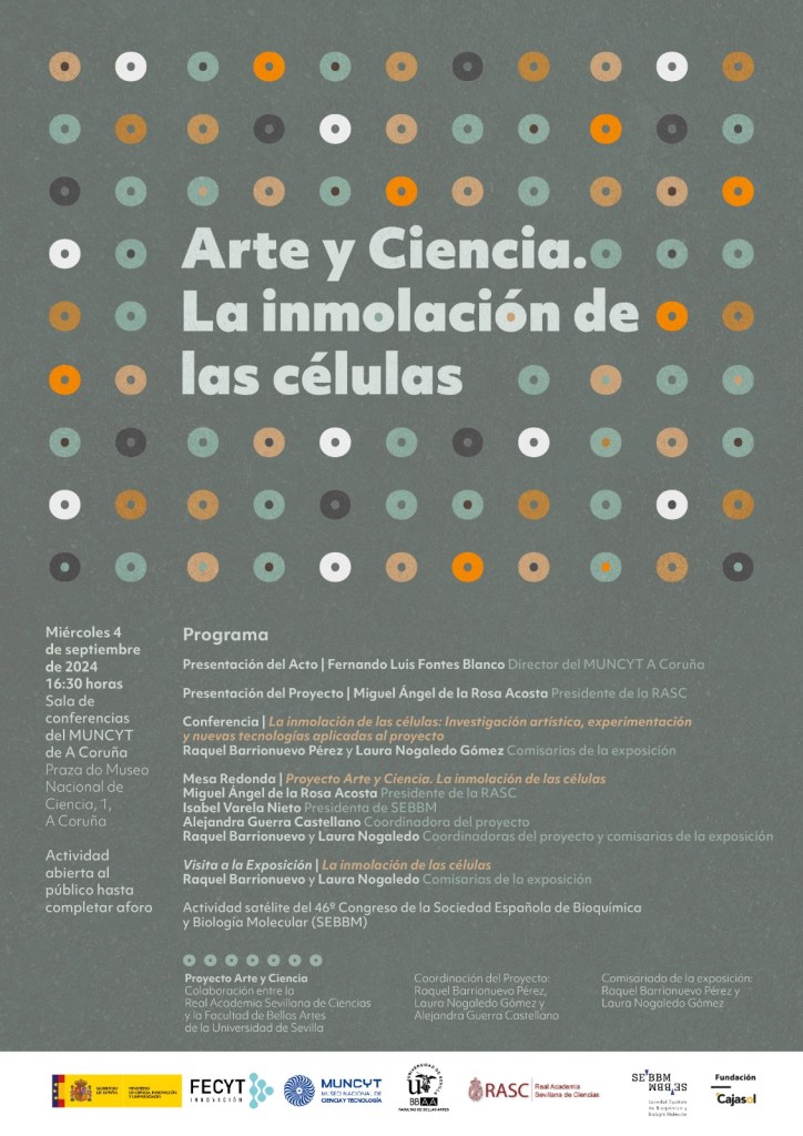 El Museo Nacional de Ciencia y Tecnología, MUNCYT, de A Coruña, la Real Academia Sevillana de Ciencias (RASC) y la Facultad de Bellas Artes de la Universidad de Sevilla con la colaboración de la Sociedad Española de Bioquímica y Biología Molecular (SEBBM) organizan el evento “Arte y ciencia: la inmolación de las células” el miércoles 4 de septiembre a las 16:30 horas como una actividad satélite del 46º Congreso de SEBBM.