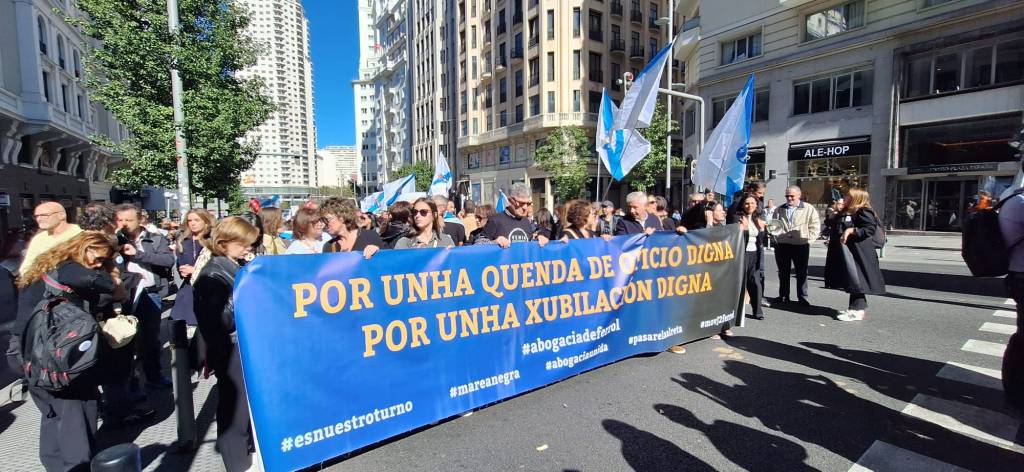 Una representación de los abogados y procuradores gallegos se manifestó hoy en Madrid junto a otros profesionales de toda España reclamando soluciones a su situación y la posibilidad de pasar las cotizaciones de Mutualidad de Abogacía y Mutualidad de Procuradores a la Seguridad Social para tener una pensión de jubilación digna.