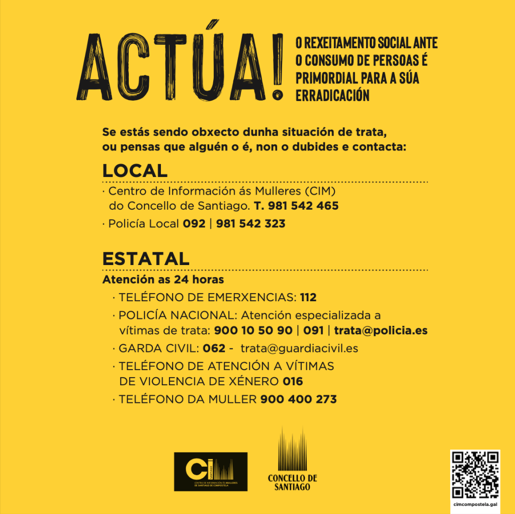 El propio Día Europeo contra la Trata de Seres humanos, el viernes 18 de octubre, se instalará una carpa en la praza do Toural en la que se distribuirán los dípticos informativos y materiales de sensibilización de la campaña ‘Se ti non tratas, non hai trata’. Estará abierta de 11.00 a 19:00 horas.