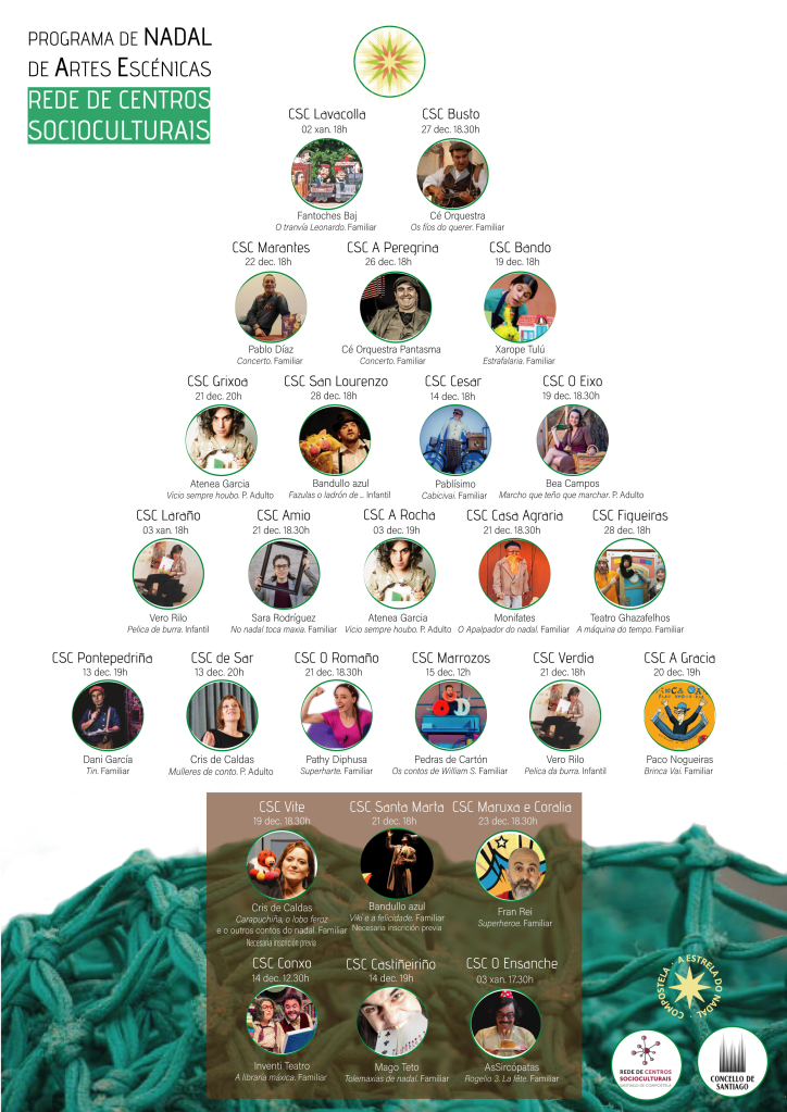 En canto á programación de artes escénicas, prevense 26 propostas diferentes que chegarán aos Centros Socioculturais ao longo de todo o mes de decembro e comezos de xaneiro. Haberá espectáculos tanto nos centros urbanos como no rural.
