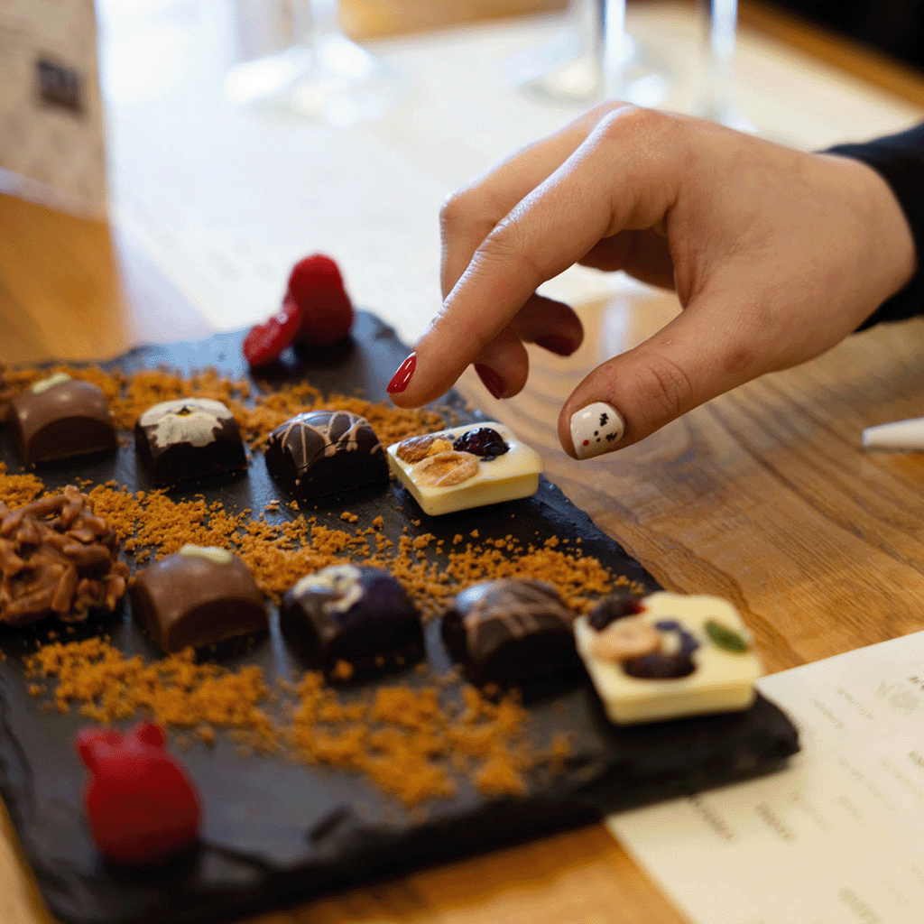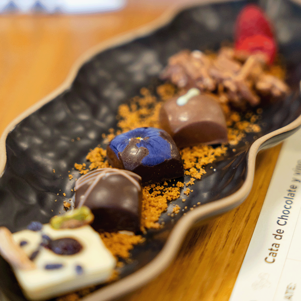 Una cata guiada que marida sus vinos y espumosos con una selección de chocolates artesanos gallegos de Fina Rei, de Allariz.