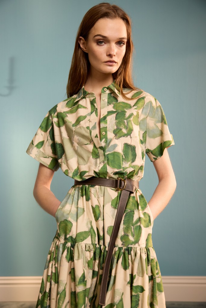 Un camisero midi de popelín en tono verde floral con amplio cuello y mangas cortas proporciona un aire ligero y fresco.