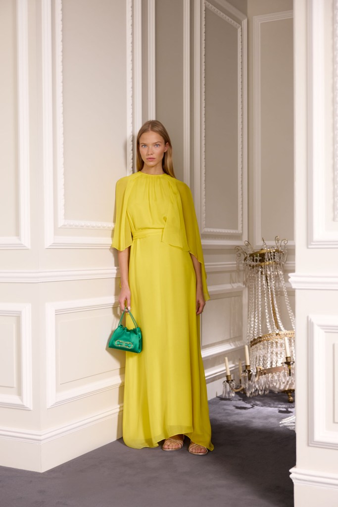 El vestido de seda chiffon amarillo canario sin mangas destaca con su silueta A-line hasta el suelo y capa adjunta, mientras que el vestido Fit-and-Flare de seda chiffon rosa chicle ofrece una frescura elegante con detalles drapeados.
