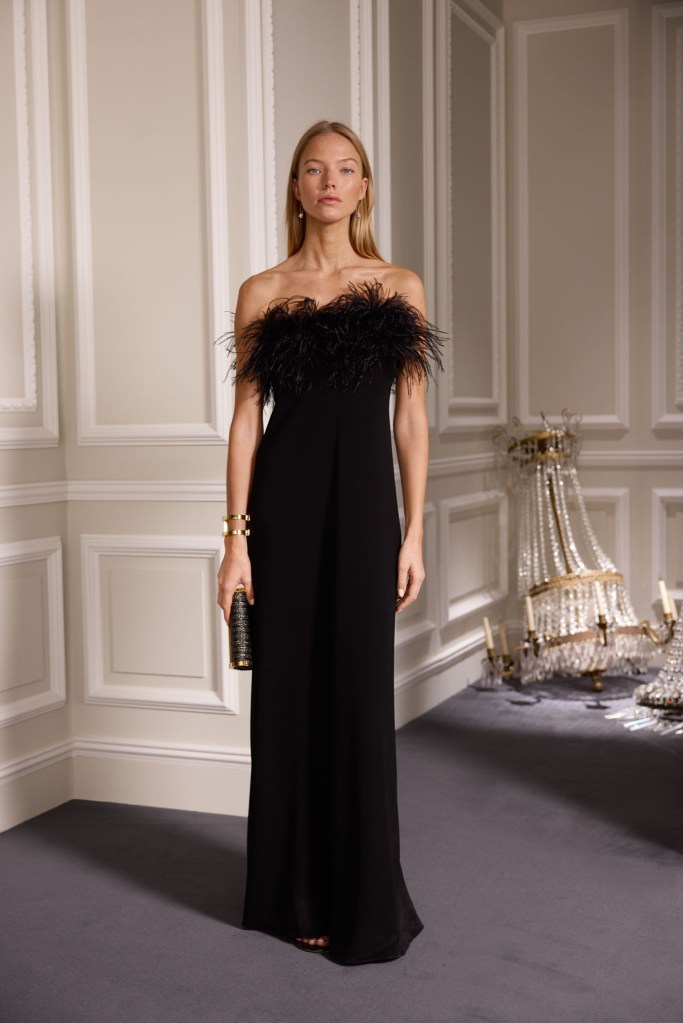 Las piezas más destacadas incluyen el vestido largo sin tirantes de crepé con escote de plumas, el vestido floral Fil-Coupé en rojo, y el vestido de tul bordado con un cinturón de grosgrain a tono y con el característico lazo doble de la compañía ourensana.