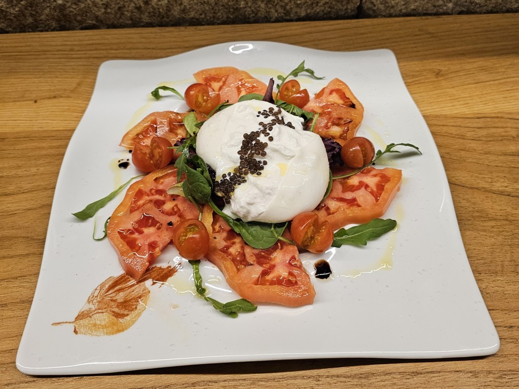 Ensalada de burrata con perlas de trufa negra, ovos fritos trufados, solombo de tenreira, foie e salsa de trufa… A que se che fai a boca auga?