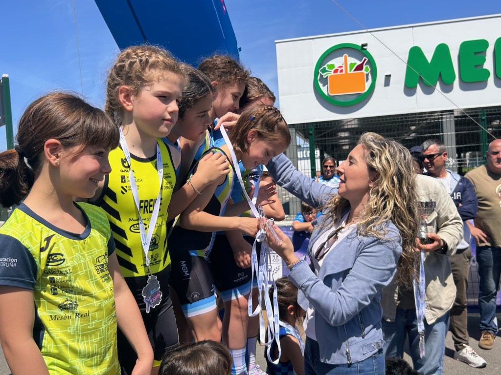 A delegada territorial da Xunta en Ferrol, Martina Aneiros, participou esta mañá na entrega de premios do campionato provincial de dúatlon escolar que se levou a cabo no polígono das Lagoas, en Narón. A proba, organizada polo club AD Náutico Narón, desenvolveuse ao abeiro do programa Xogade (Xogos Deportivos Galegos en Idade Escolar) para o curso 2024/2025 que promove a Secretaría Xeral para o