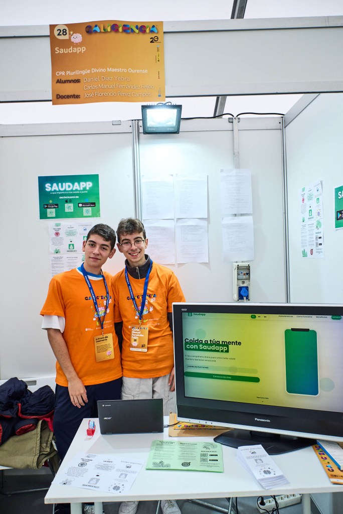 O segundo equipo clasificado foi o formado por Daniel Díaz e Carlos Fernández, do CPR Divino Maestro de Ourense, que deseñaron “SaudApp”, unha solución dixital sinxela e eficaz para que calquera persoa poida coidar a súa saúde mental. A aplicación permite rexistrar o estado emocional a través dun formulario diario, practicar meditación, levar un diario de gratitude e acceder a contidos recomendados como vídeos, podcasts e artigos sobre benestar mental. Ademais, conta cun sistema de recompensas baseado en rachas diarias: os usuarios acumulan moedas que poden gastar en personalizacións como fondos, músicas e audios de meditación guiada. “Se as persoas usan SaudApp de maneira constante, adoptarán hábitos máis saudables e mellorarán o seu benestar mental e emocional” -aseguran-. Este segundo premio, de 500 €, permitiralles participar na Zientzia Azoka, a feira de ciencia que ten lugar cada ano en Bilbao.