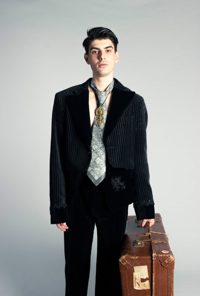 Diáspora componse de tres estilismos —dous femininos e un masculino— e parte dunha inspiración moi concreta: a vestimenta tradicional de loito en Galicia, ese loito polos vivos que emigraban sen saber se volverían. A través de tecidos ricos como adamascados, veludos, pedrería, bordados e o emblemático encaixe de Camariñas, Laura Villar Loureiro ofrece unha reinterpretación contemporánea da tradición galega, á vez que reivindica a identidade cultural e denuncia a falta de valoración das raíces propias fronte ao foráneo.