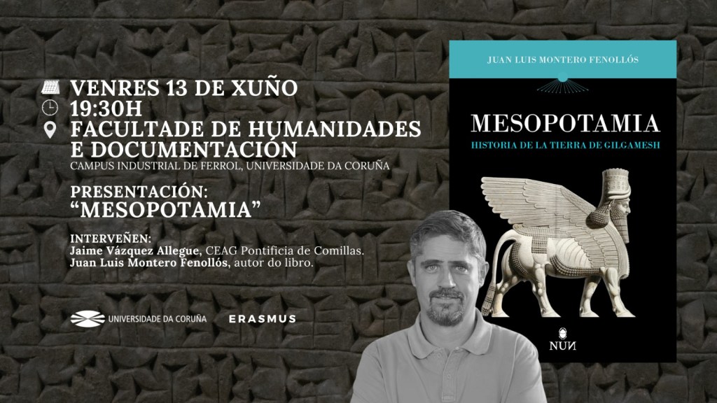 O Salón de Graos da Facultade de Humanidades e Documentación do Campus Industrial de Ferrol acolle, este venres 13 de xuño, ás 19:30 horas, a presentación do libro Mesopotamia (Editorial Erasmus, 2025) escrito polo profesor de Historia Antiga da Universidade da Coruña (UDC), Juan Luis Montero Fenollós. No acto, estará acompañado polo profesor do Centro de Enseñanza Superior Alberta Giménez (CESAG) da Universidad Pontificia Comillas, director da revista Reseña Bíblica e autor de numerosas e importantes obras sobre o cristinanismo, Jaime Vázquez Allegue.