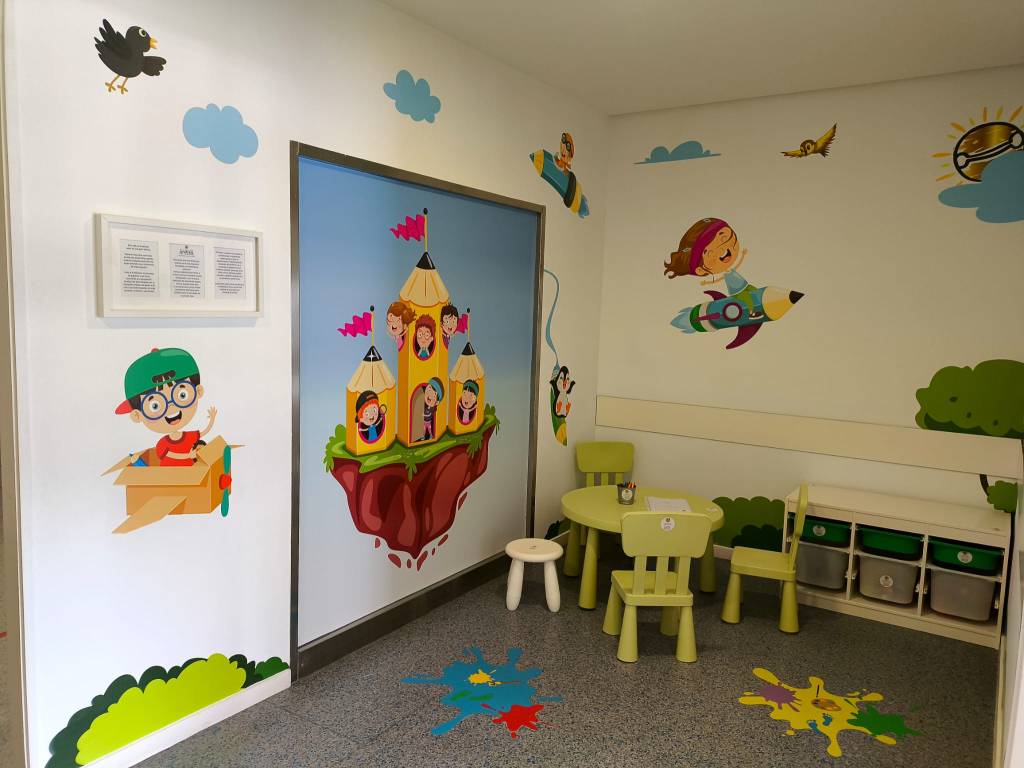 El proyecto ha englobado la incorporación de una nueva sala de espera infantil, la transformación del espacio mediante el vinilado de paredes y puertas, la aportación de mobiliario, material lúdico, y se ha actuado también en el interior de las consultas, incorporando elementos móviles en techos, así como el vinilado de las paredes.