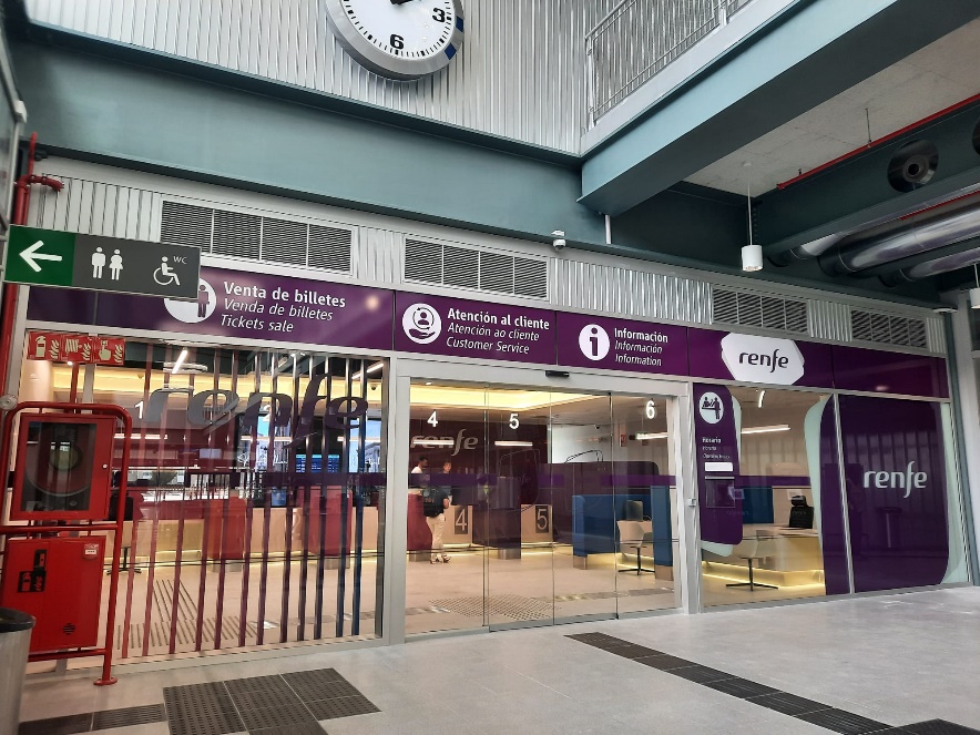 Desde mañana, 26 de junio, se podrán adquirir billetes y recibir atención presencial e información en la nueva oficina de Renfe en la intermodal compostelana, que centraliza los servicios ferroviarios y de autobuses. Desde el acceso principal en la Rúa do Hórreo, los viajeros podrán acceder al interior del edificio, donde está ubicado el nuevo espacio de Renfe, que aúna en un mismo lugar los servicios de venta de billetes, información y de atención al cliente.