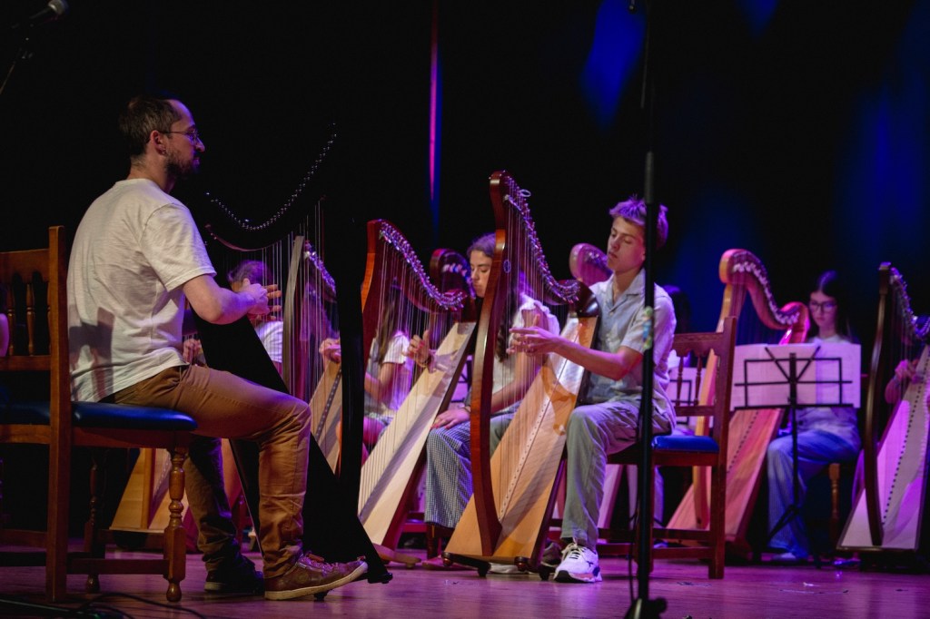 O IV Encontro do alumnado das escolas de arpa de Galicia celebrouse esta mañá no Liceo de Noia no marco da 12ª edición do Noia Harp Fest. Máis de 20 estudantes de diferentes escolas do país participaron nunha xornada moi especial, na que interpretaron xuntas pezas da tradición bretoa e galega arranxadas ex profeso para a ocasión por Kevin Le Pennec e Rodrigo Romaní.