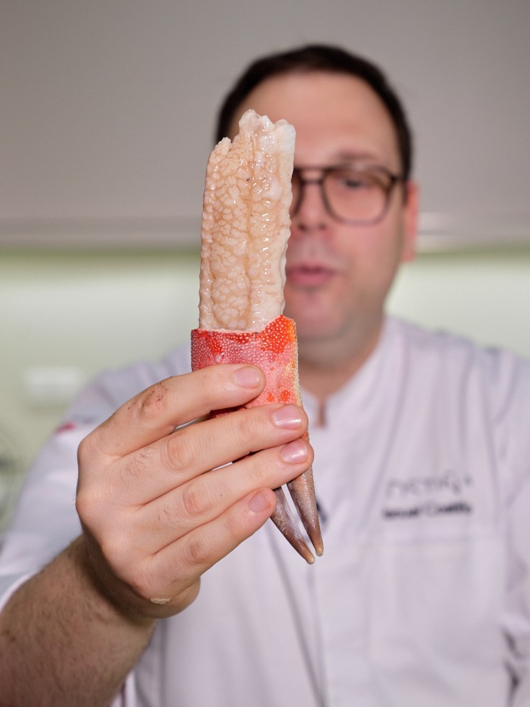Cada gesto, cada movimiento, es fruto de años de experiencia y dedicación, convirtiendo la preparación en un ritual casi ceremonial, donde el centollo se presenta impecable, terso y jugoso,